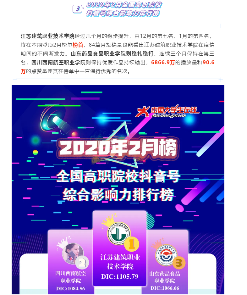近日,教育部中国大学生在线综合投稿量、播放量、点赞量、评论量、分享数、增粉数等多个数据维度,对高校及高校短视频进行遴选,发布2020年2月全国高职院校抖音号综合影响力排行榜榜单,我校官方抖音号(ID:meilisuxiaojian)荣登榜首,月投稿量84篇,其中有两篇视频作品在“全国高校抖音号‘热点60秒’话题视频top10”排行榜2月榜中分别位居第五和第十。