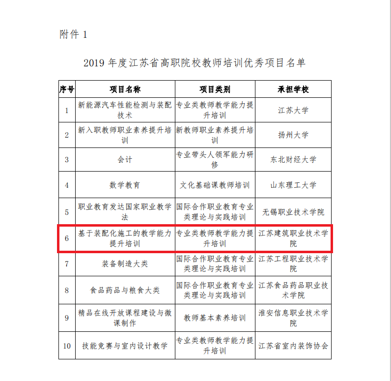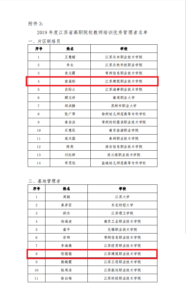 近日,江苏省高等职业教育教师培训中心下发《关于表彰2019年度全省高职院校教师培训优秀管理者、优秀授课教师(团队)和优秀项目的决定》(苏高职培函〔2020〕1号),我校建筑建造学院承办的“基于装配化施工的教学能力提升培训”省培项目获评2019年度江苏省高职院校教师培训优秀项目,苗磊刚获评2019年度江苏省高职院校教师培训优秀管理者(片区联络员),程强强获评2019年度江苏省高职院校教师培训优秀管理者(基地管理者)。