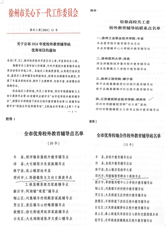 近日,徐州市关心下一代工作委员会发布《关于公布2024年度校外教育辅导站优秀项目的通知》,我校关工委帮扶共建的校外教育辅导站——邳州市陈楼镇陈玉文向日葵读书点被评为2024年度“全市优秀校外教育辅导站”、邳州市邢楼镇郁雪群向日葵读书点被评为2024年度“全市优秀校地合作校外教育辅导站”。